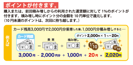 - ICカード乗車券ラピカ(Rapica)に購入又は前回積増しからの利用された運賃額に対して1%のポイント分が付きます。