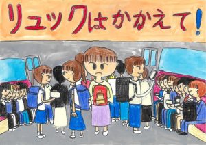 大きなリュックを担いで乗車をする、学生の皆さんに向けられたポスターですね。背負っている荷物は他の人の迷惑になっていることに、本人は意外と気が付かないものです。