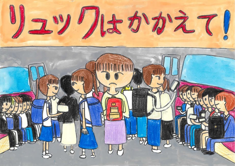 小学生のリュック等の荷物に着目したポスターです。中央の子は前持ちしてますが、周囲の子供たちは何かに夢中で気が付いていないところがギャップがありますね。防犯の面からも気を付けてもらいたい乗車マナーですね。